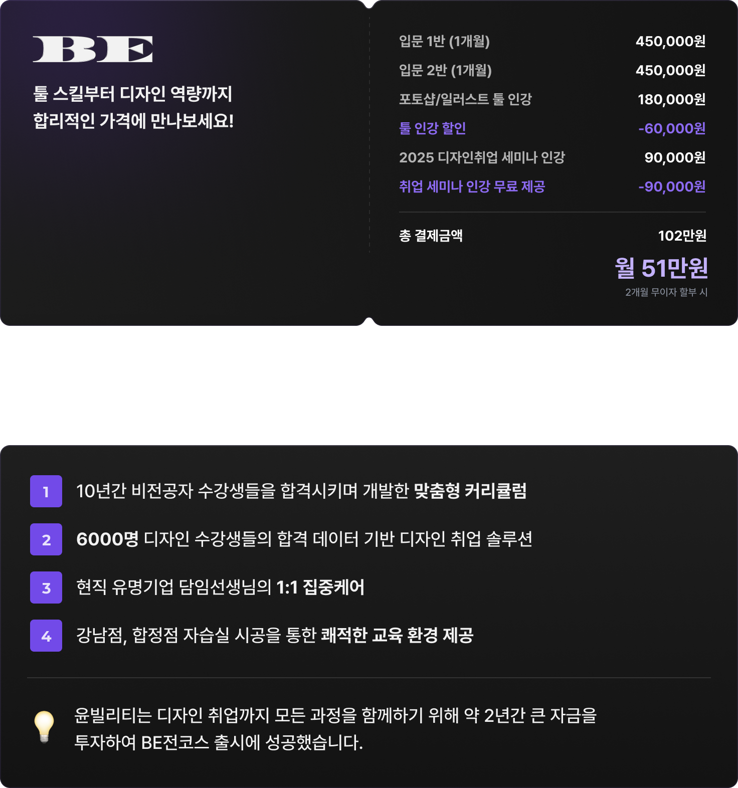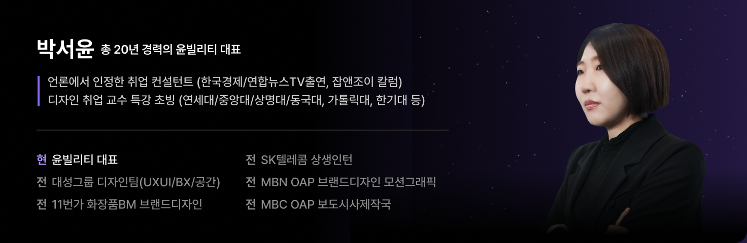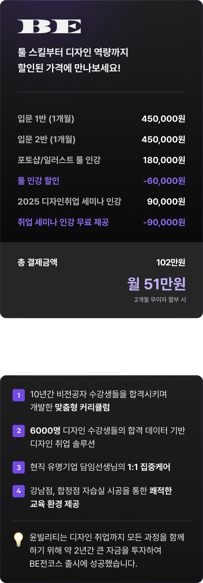 1년에 2번만 진행되는 프로모션 코스입니다. 합리적인 가격으로 고퀄리티의 포트폴리오 현장 강의와 온라인 툴 강의를 수강하실 수 있으며, 박서윤 대표님의 취업 세미나까지 인강으로 무료 수강하실 수 있습니다.