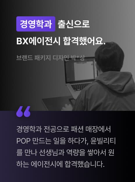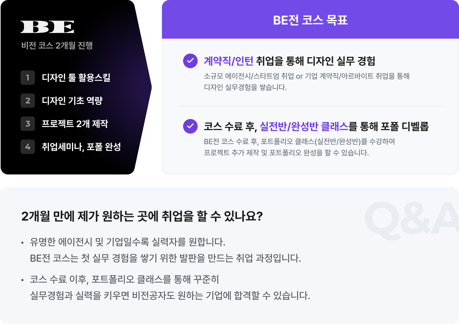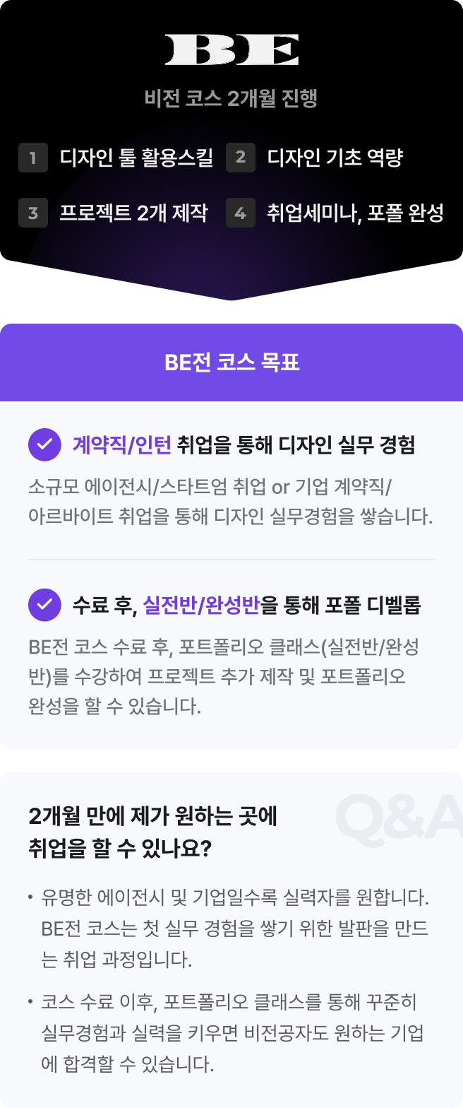 네, 가능합니다. 다만 수강생 개인 역량에 따라 수강기간이 늘어날 수 있습니다. BE전 코스는 원하는 최종 기업에 가기 전, 실무 경험을 쌓기 위한 과정으로 광고/소규모 에이전시와 기업의 계약직/아르바이트를 목표로 진행됩니다.