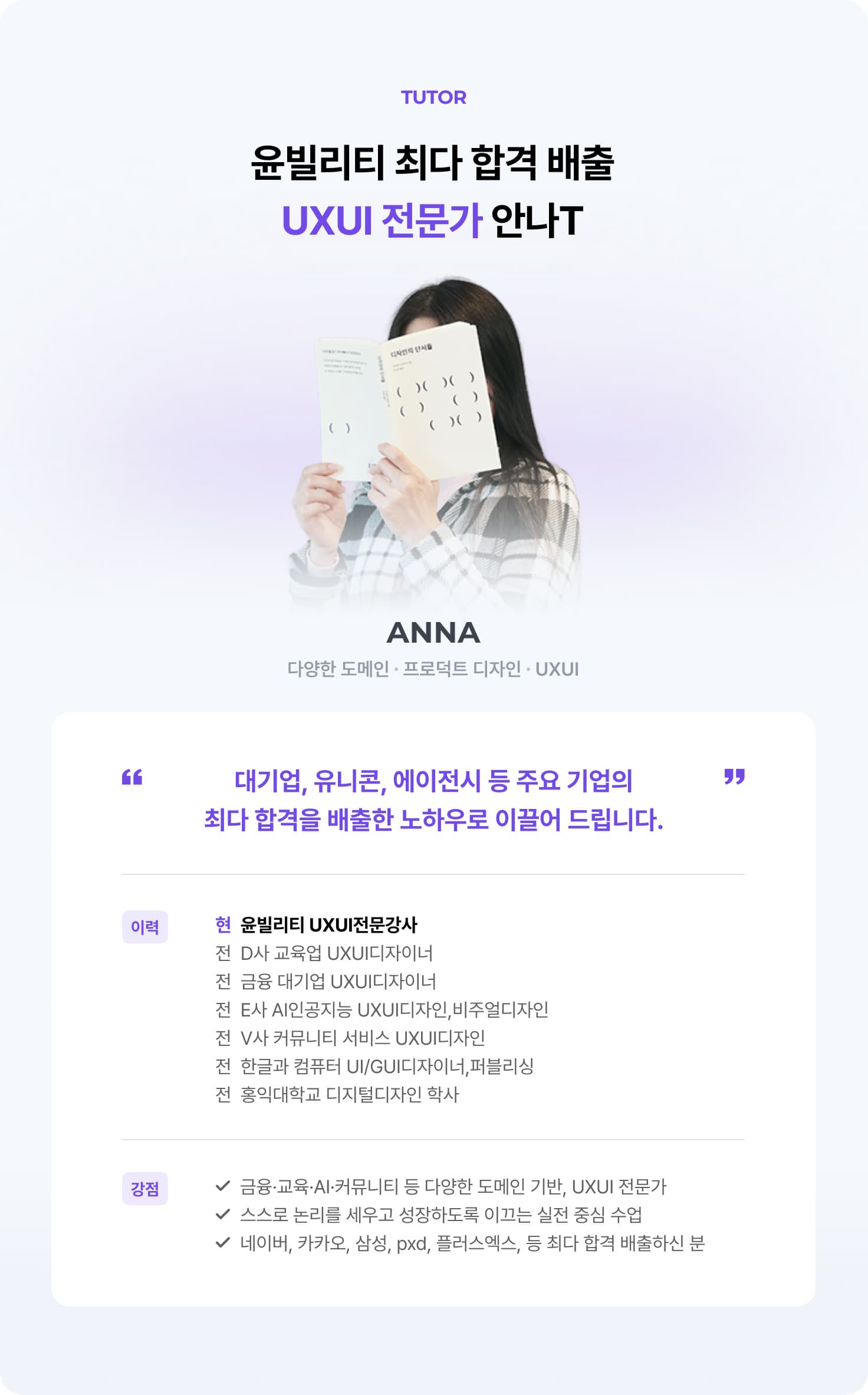 윤빌리티에서는 상담을 통해 수강생의 직무·목표·스타일에 가장 잘 맞는 현직 강사진을 매칭해드립니다. 특정 산업군, 대기업, 에이전시 취업 등 관심 분야에 따라 가장 적합한 강사님을 연결해드립니다.