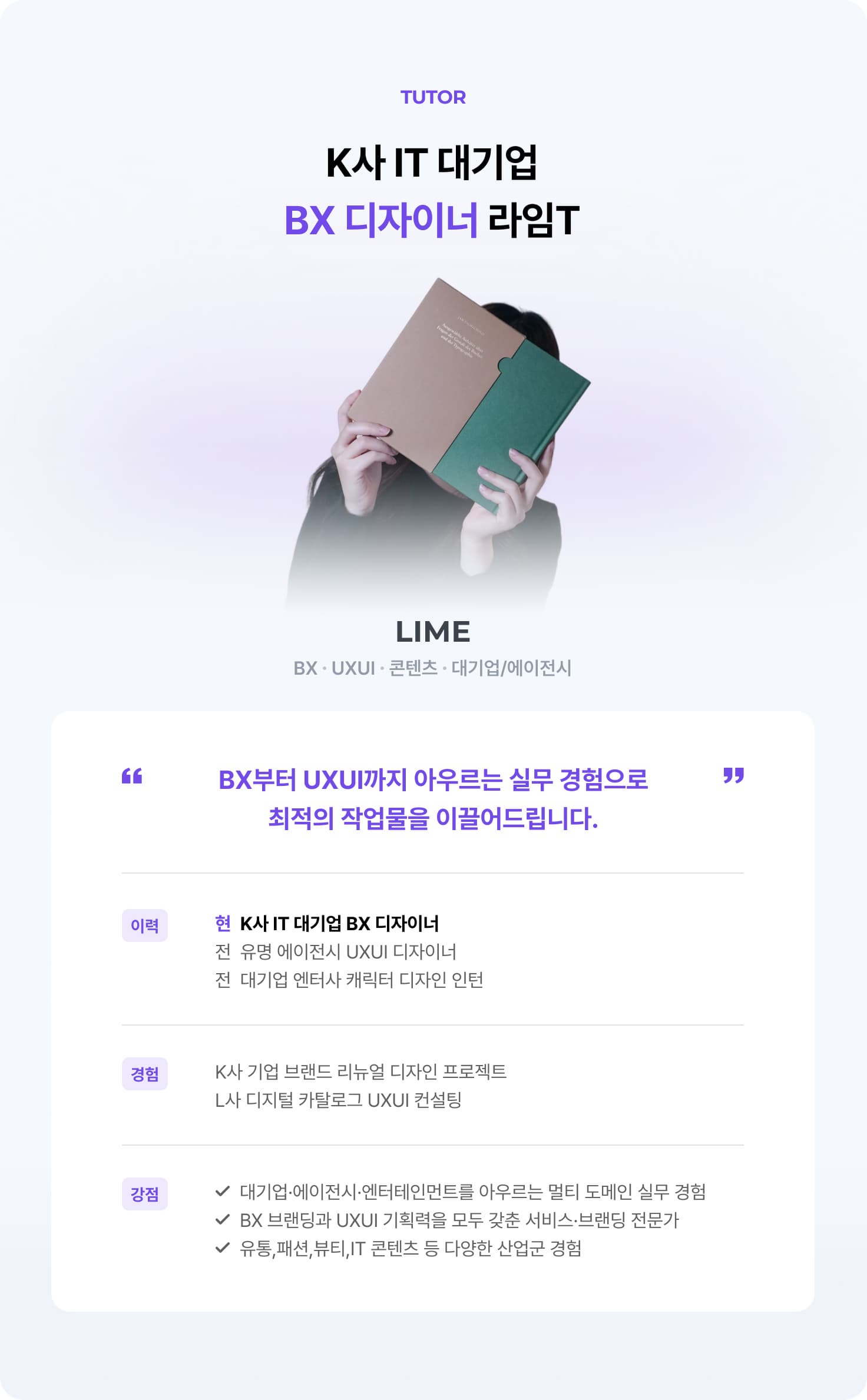 윤빌리티에서는 상담을 통해 수강생의 직무·목표·스타일에 가장 잘 맞는 현직 강사진을 매칭해드립니다. 특정 산업군, 대기업, 에이전시 취업 등 관심 분야에 따라 가장 적합한 강사님을 연결해드립니다.
