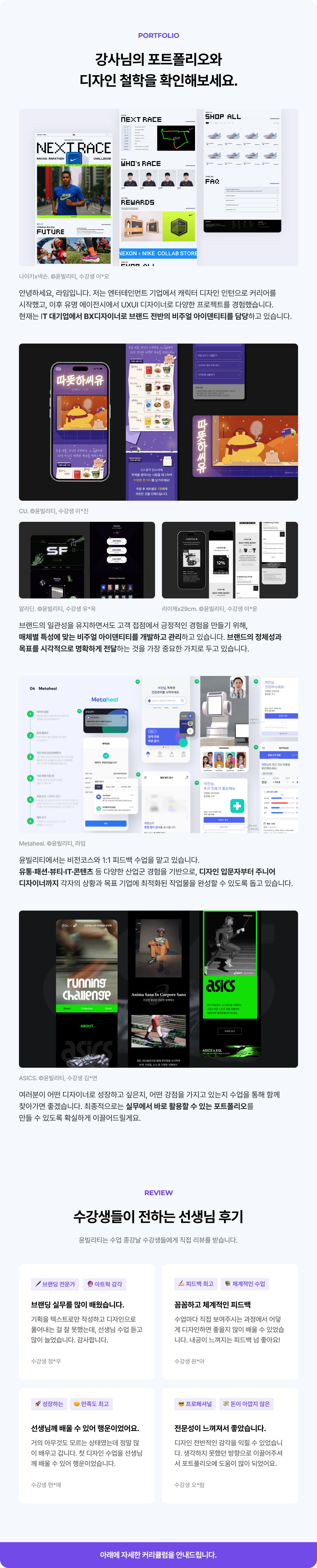 윤빌리티 포폴 클래스는 오프라인 중심으로 진행됩니다. 온라인 수강을 원하시는 분들께는 빌리스 디자인 직무 인강 혹은 1:1 화상 포트폴리오 피드백을 추천드립니다.
