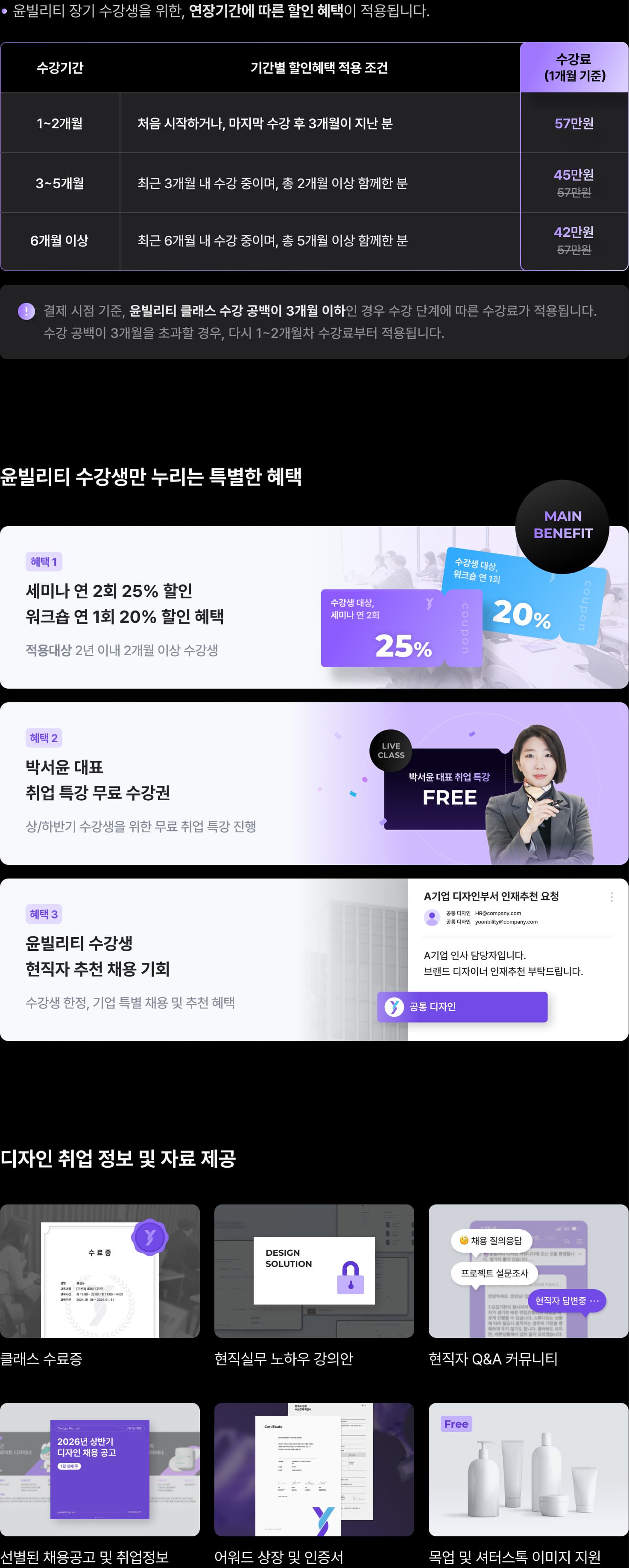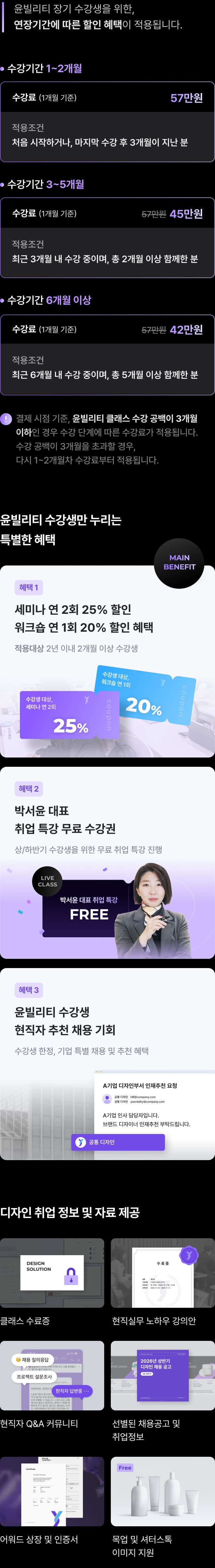 디자인 취업전문가 박서윤 대표의 체계적인 커리큘럼이 준비되어 있습니다. 수강생을 위한 정기 무료 특강이 매년 진행되며, 심화 컨설팅이 필요한 경우 <디자인 취업 완성반> <1:1 면접 컨설팅> <1:1 자소서 첨삭> 등 전문 프로그램을 추가로 수강하실 수 있습니다.